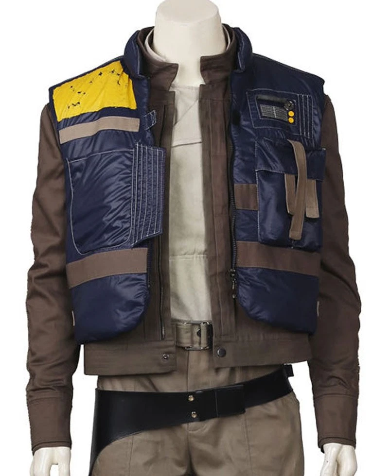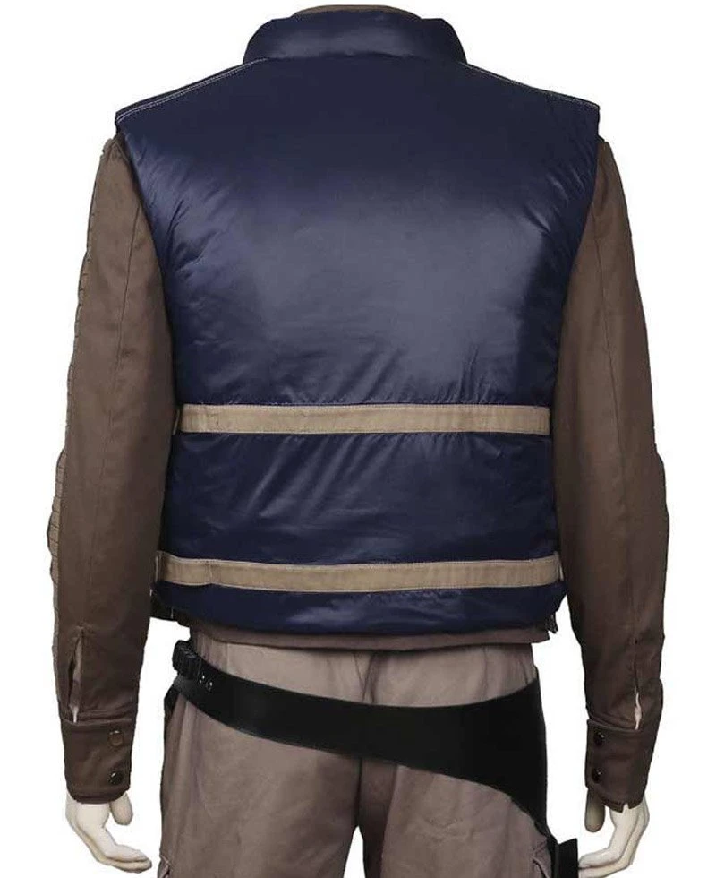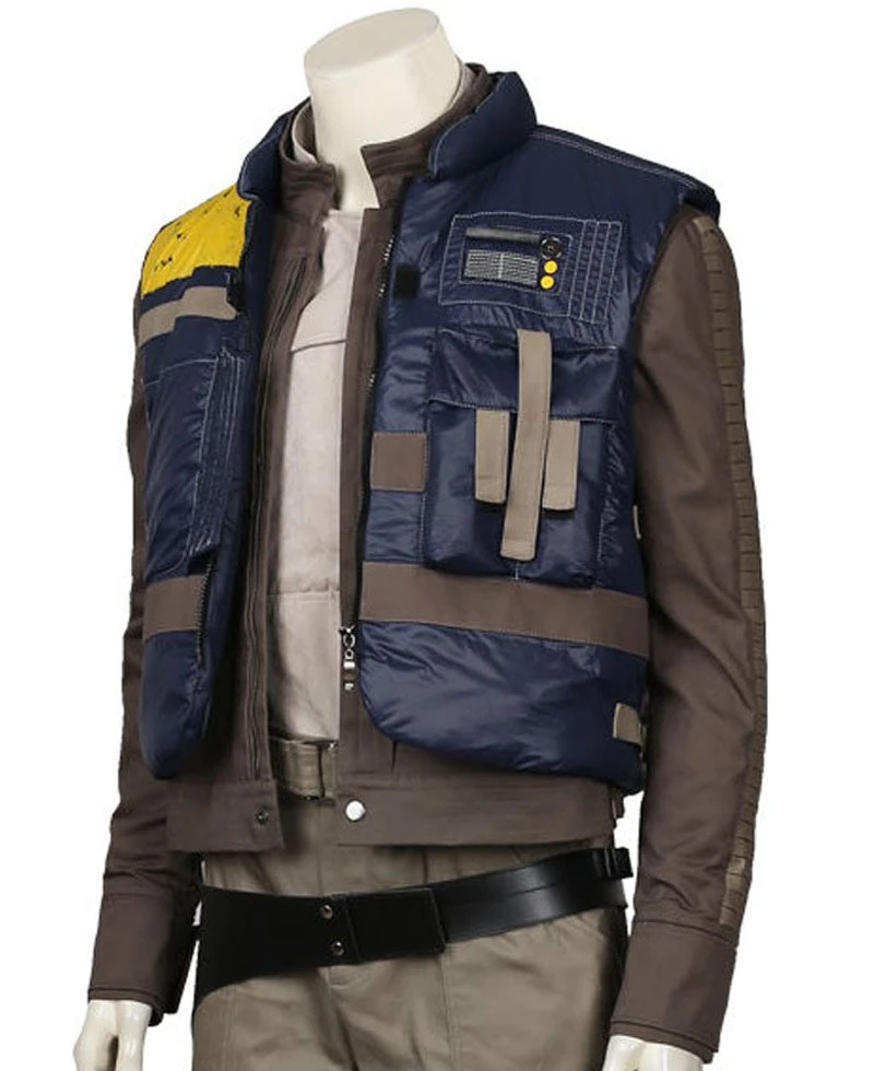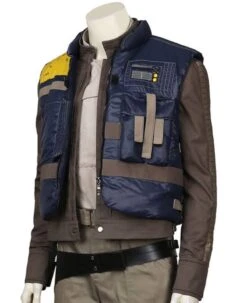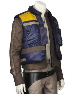The outer shell of Cassian Andor Vest is made from satin fabric. Soft inner viscose lining gives you extra comfort. The vest is in padded form that has made the appearance unforgettable. Blue color is looking fascinating. Star Wars Rogue One Vest has front zipper closure. One pocket is given on left side of the front. Leather fixtures have increased the charm of dress. Yellow patch is added on right shoulder of Captain Cassian Andor Vest.