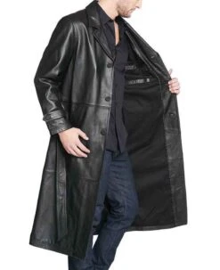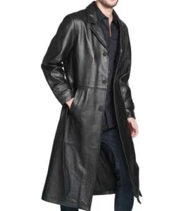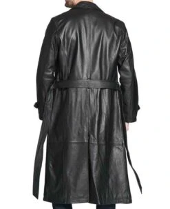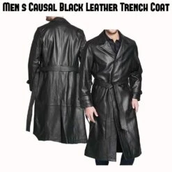 Men’s Causal Wear Belted Button Closure Black Leather Trench Coat