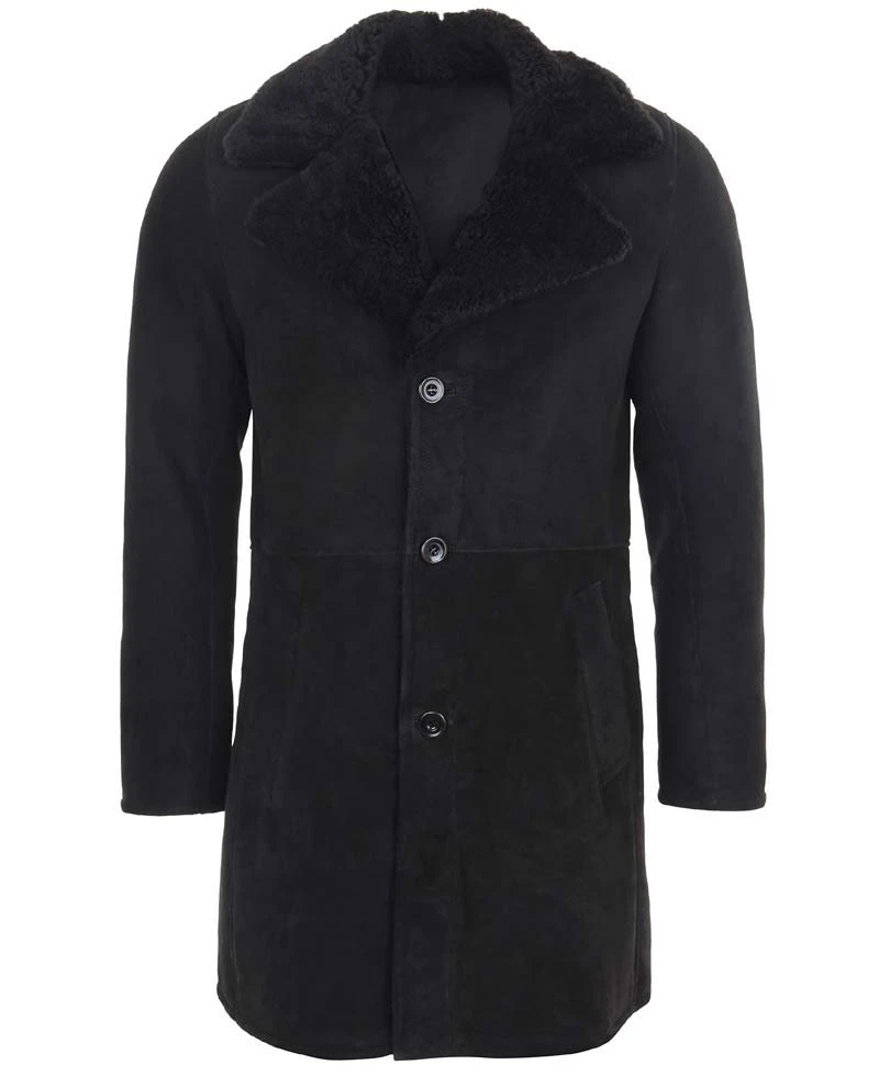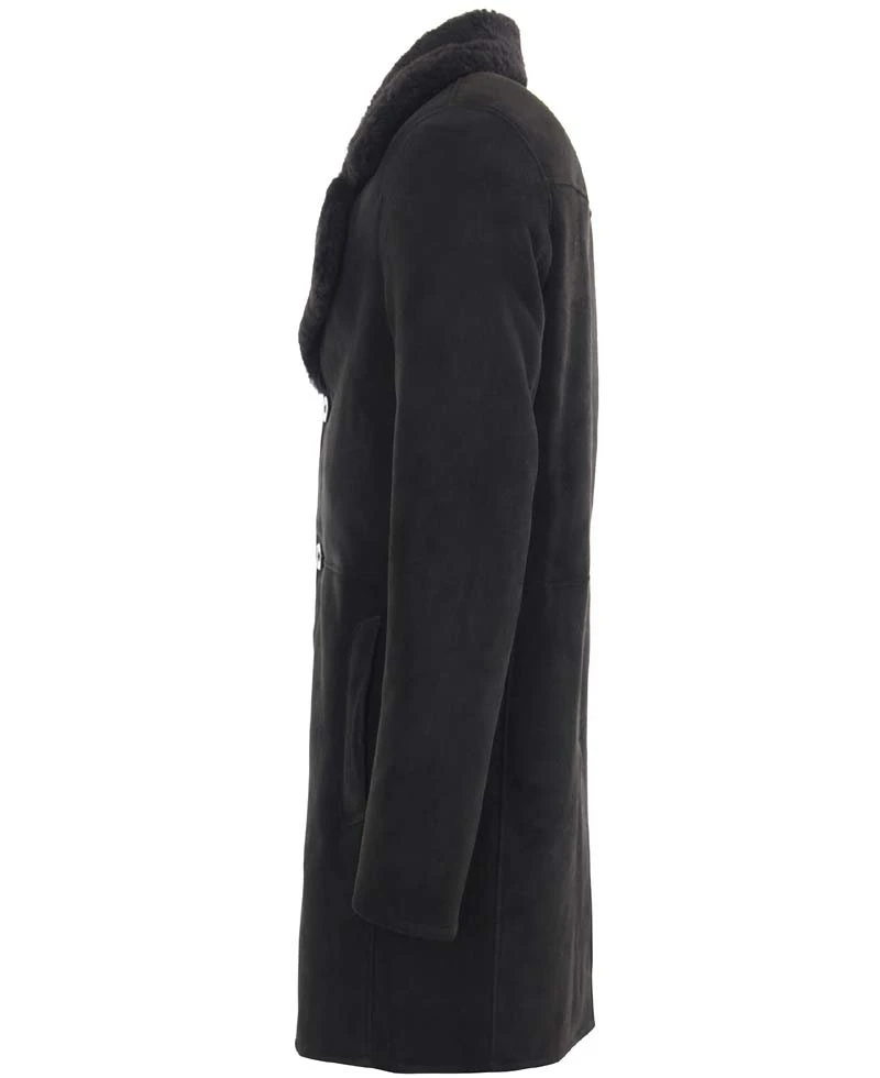 mens black suede shearling coat is fabricated from an high and guaranteed quality of suede leather material. The long-lasting material is used in the formation and is assured. This coat is very comfortable as it contains an inner soft shearling lining. This coat will secure you against cold weather and will make you feel warm and cozy. mens black suede shearling coat is long in length. This coat has front button stylish closure that makes this garb very attractive and appealing. This coat has full length sleeves on open hem cuffs. There are front side pockets as well to secure stuff in them. This coat has shearling notch style collar.You will appreciate each detailing on this coat. This coat is available here in black color. Order this coat right now and get your hands on it. Order this coat right now.