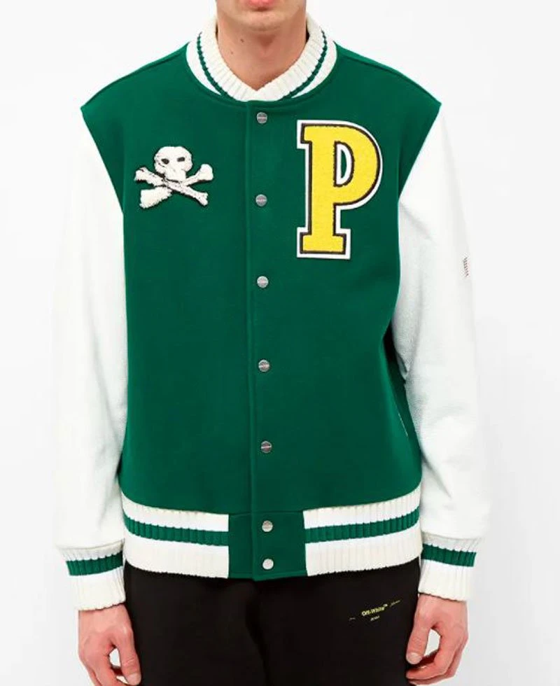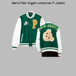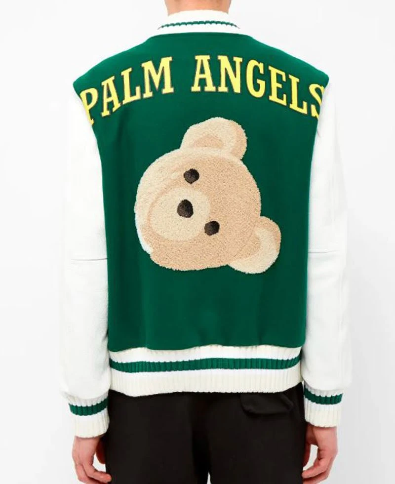 The very stylish palm angels varsity jacket is perfect for parties and outings. It has attractive and appealing green and white color combination. The outer side of this varsity jacket is fabricated with wool fabric. High-quality genuine leather material is also used for the sleeves. The internal side of the palm angels varsity jacket is stitched with smooth and soft viscose lining. It has buttons attached to its front side for closure. Palm angels college varsity jacket a rib knitted style collar. The jacket has a rib knitted hemline as well. The palm angels varsity jacket has rib knitted style cuffs on full-length leather sleeves. There are two front waist pockets on this varsity jacket where you can secure stuff. On the backside of this varsity jacket is a Palm Angels design.