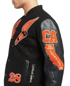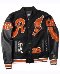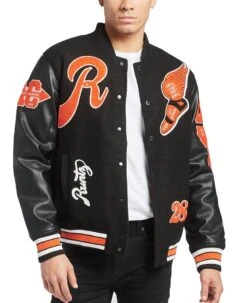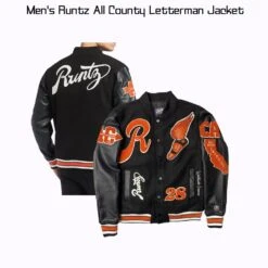 The stylish Runtz letterman jacket is fabricated by using premium quality wool fabric. The black color gives this letterman jacket an attractive appearance. The Runtz letterman jacket has an internal lining of smooth and soft viscose attached that keeps you warm and comfy. Genuine leather material is used as well for the making of sleeves. The Runtz letterman jacket has buttons attached to its front side for closure. There is a rib knitted hemline on this varsity jacket that gives it a fitted look. All County varsity jacket has two front waist pockets where you can secure stuff. It has long-length style leather sleeves on rib knitted style cuffs. The letterman jacket has an erect style collar as well. The jacket has the Runtz logo on the front and on the back.