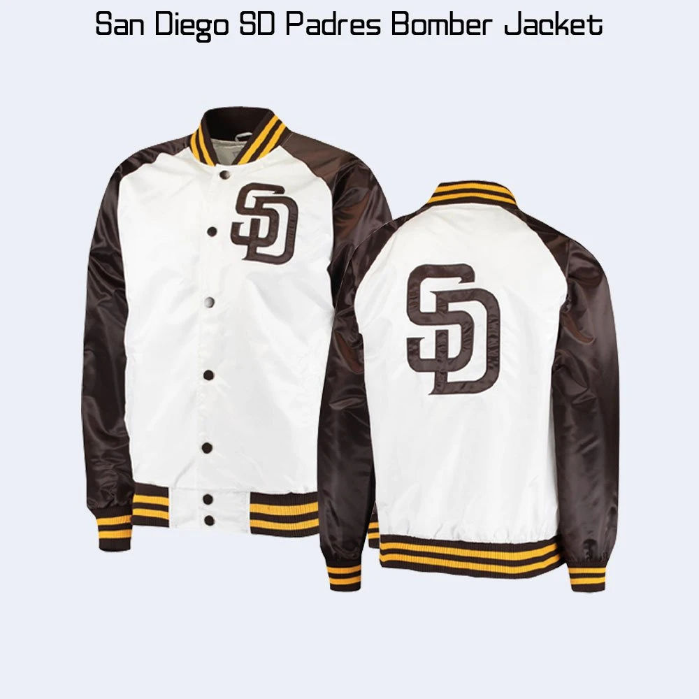 The SD jacket has a very stylish and classy look. The external side of this bomber jacket is fabricated by using premium quality satin fabric. The jacket comes in an appealing black and white color combination. The internal side of this stylish SD jacket is lined with smooth and soft viscose lining that keeps you warm and comfortable all the time. There are buttons attached to the front side of this bomber jacket for the closure. The stylish padres san Diego varsity jacket has rib knitted style cuffs on full-length style sleeves. There are rib knitted style cuffs on full-length style sleeves. The jacket comes with two front waist pockets where you can secure stuff. Also, the rib knitted hemline gives the jacket a fitted look. Also, there is an SD Logo on the chest of this bomber jacket.