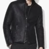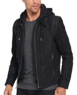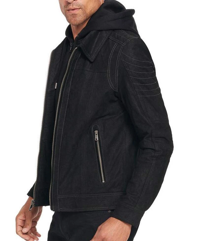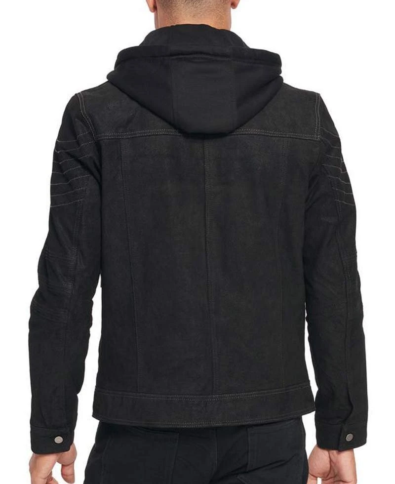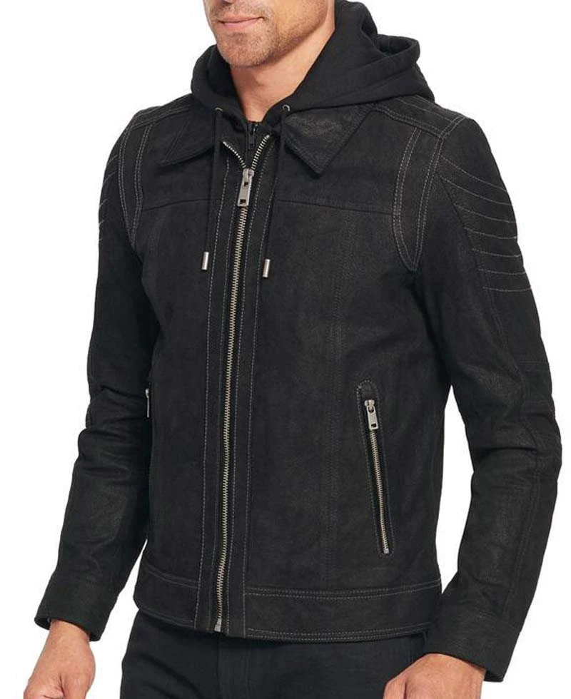 Men’s Causal Suede Black Leather Jacket with Removable Hoodie