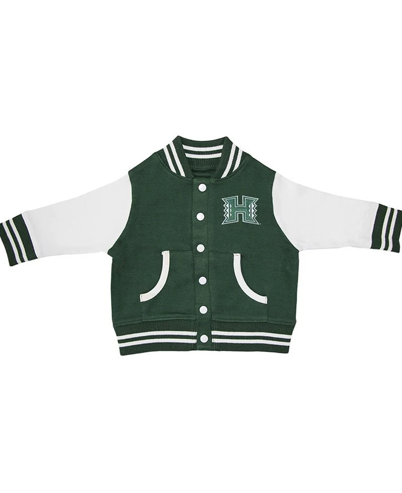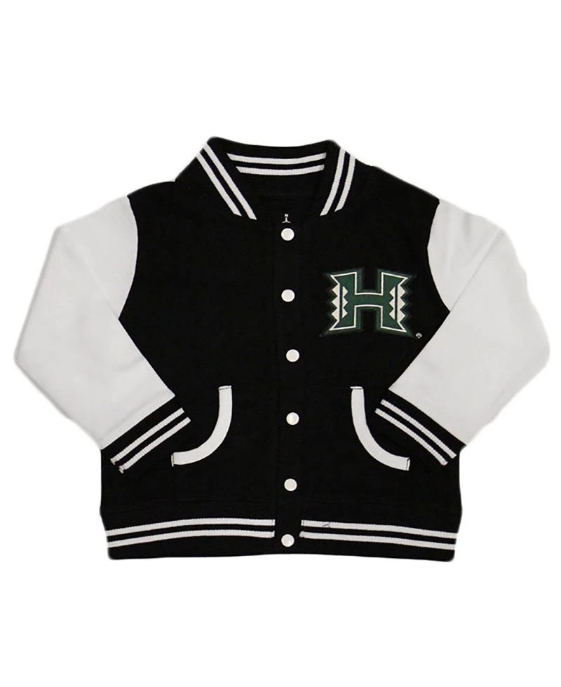 The stylish Hawaii Varsity jacket comes in an attractive black/white or green/white color combo. The external side of this varsity bomber jacket is fabricated with premium quality wool fabric. High-quality genuine leather material is used in the manufacturing of the sleeves. The inner side of this Hawaii varsity jacket is stitched with smooth and soft viscose lining that keeps you warm and comfortable. The jacket has buttons attached to its front side for closure. The University of Hawaii rainbow warriors varsity jacket has rib-knitted style cuffs on full-length style leather sleeves. The jacket has two front waist pockets where you can secure stuff. The University of Hawaii rainbow warriors varsity jacket has an erect style collar. The jacket also has a rib knitted hemline which gives it a fitted look.