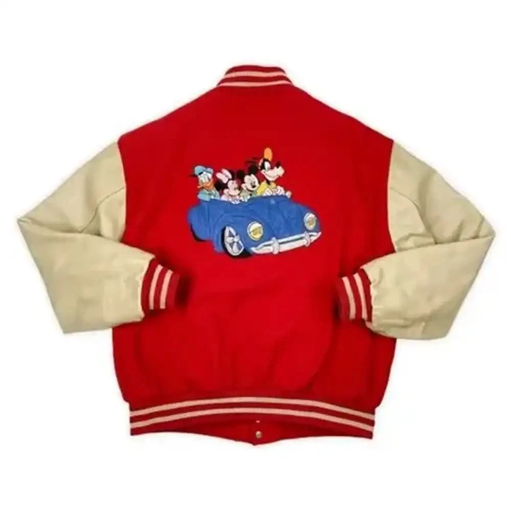 This Winter, Add New Outfit Into Your Wardrobe That Can Pop Up Your Childhood Memories Just You Need to Shop and Wear the Mickey Mouse Varsity Red Jacket. Its Top-quality Wool and Leather Fabrication Makes It Warm and Highly Fashioned and It’s Soft Viscose Inner Makes It Comfortable. The combination of Red and Beige Colors Makes It Too Attractive to Wear. The Mickey Mouse Vintage Varsity Red Jacket Has Been Designed by Using Features Like a Rib-knitted Stand-up Collar, Snap Tab Buttoned Closure, Rib-knitted Cuffs, and Hemline and Side Waist Pockets. The Mickey Mouse Varsity Jacket Will Allow You to Wear It Casually to Carry Your Casual Looks to the Next Level.