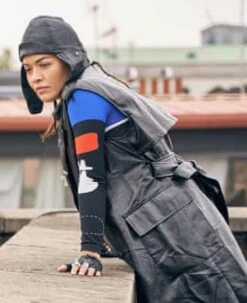 The idea of this classy coat is taken from the 2021 popular British crime drama movie called Twist where the actress Rita Ora wore this coat when she was portraying the character of Dodge. The external side of this coat is manufactured by using rich and premium quality faux leather or genuine leather material. The appealing black color makes this coat attractive to wear. The inner side of this Dodge coat is stitched with a smooth and soft viscose lining that guards you against cold weather and keeps you warm and comfy. The coat has a stylish turn-down style collar. The Dodge coat comes with an open style front look. There are two front waist pockets on this coat where you can secure stuff. Rita Ora Twist leather coat has shoulder epaulets too. The sleeveless look on this coat makes it perfect to wear.