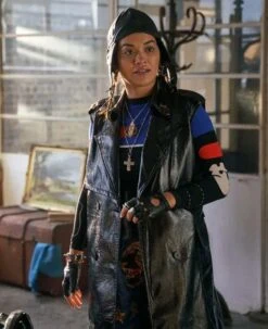 The idea of this classy coat is taken from the 2021 popular British crime drama movie called Twist where the actress Rita Ora wore this coat when she was portraying the character of Dodge. The external side of this coat is manufactured by using rich and premium quality faux leather or genuine leather material. The appealing black color makes this coat attractive to wear. The inner side of this Dodge coat is stitched with a smooth and soft viscose lining that guards you against cold weather and keeps you warm and comfy. The coat has a stylish turn-down style collar. The Dodge coat comes with an open style front look. There are two front waist pockets on this coat where you can secure stuff. Rita Ora Twist leather coat has shoulder epaulets too. The sleeveless look on this coat makes it perfect to wear.